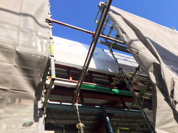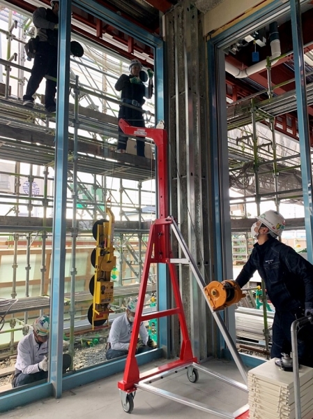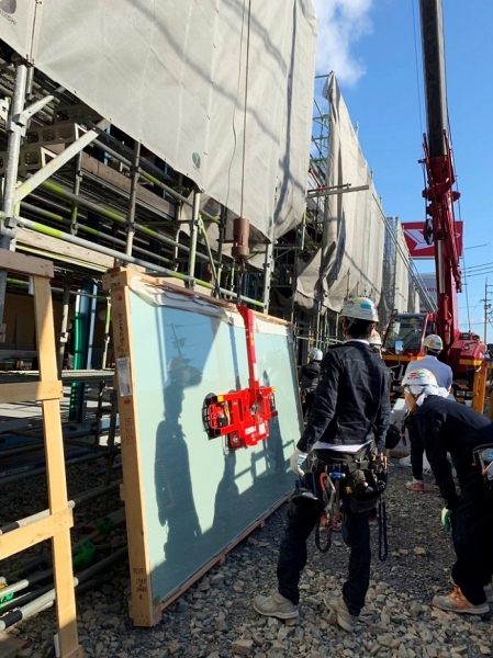 フロントサッシに15mmガラスで1650×4400(270kg)8枚他38枚施工した建物です。