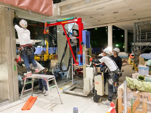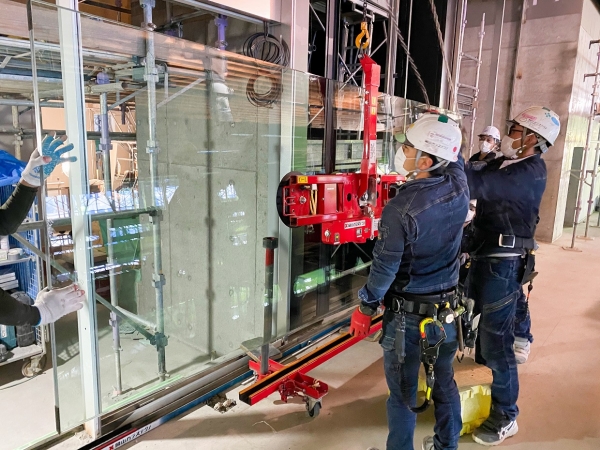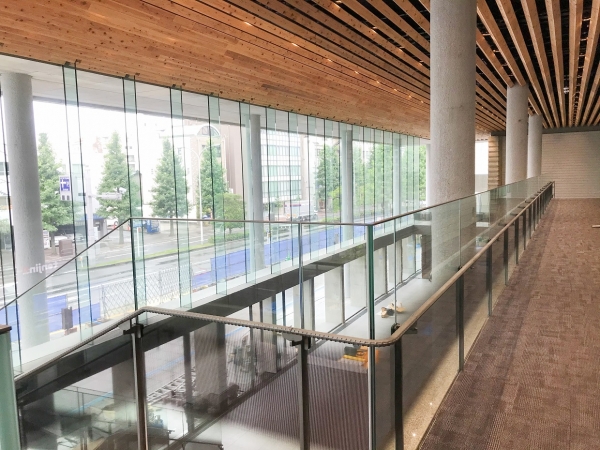 2階吹抜けでスタビライザー工法のフェイスガラスには19ミリで1550×6050(450kg)を32枚、リブには30mm合わせガラス29枚使用した建物です。