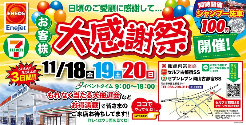 11月18日(金)19日(土)20日(日)の3日間、セルフ古都宿SSとセブンイレブン岡山古都宿店にてお客様大感謝祭を開催します! 2,000円以上の給油でご参加いただける空くじなしの大抽選会や、ちびっ子限定大抽選会などお得満載で皆様をお待ちしております。 ぜひこの週末は、セルフ古都宿SSとセブンイレブン岡山古都宿店にご来店ください。 イベントタイム:9:00~18:00