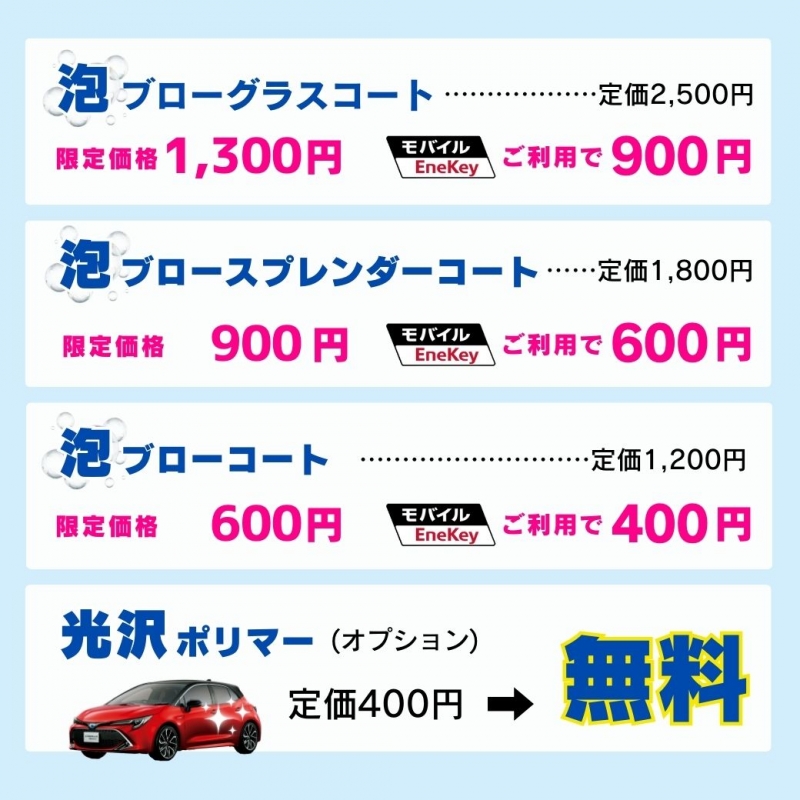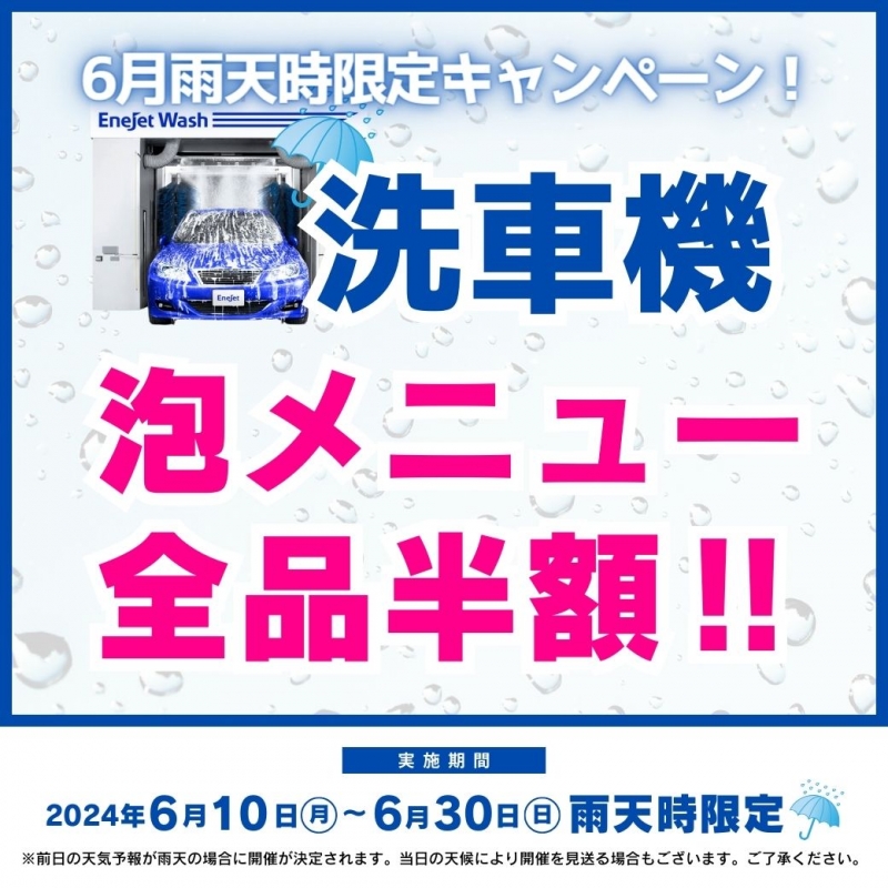 こんにちは、平野SSです! 6月10日(月)から雨天時限定★ 洗車機泡メニュー半額!光沢ポリマー無料!キャンペーンを開催します♪ 価格など詳しくは画像をご覧ください。 開催は前日の天気予報にて決定いたします。 開催時は店頭看板で掲示し、Instagramにてストーリーを投稿します。 見逃さないようぜひチェックしてくださいね♪