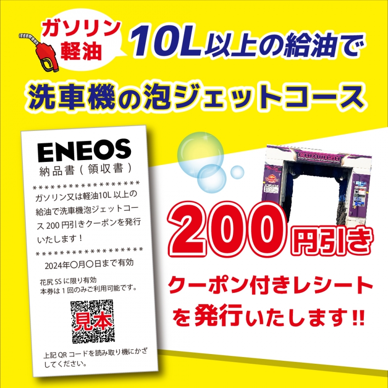 花尻SSだけ!ガソリン・軽油を10L以上給油していただくと 洗車機の泡メニューが200円引きになる クーポン付きレシートを発行中♪ 終了期間は未定です! 早めにGETしてお得に洗車★ ご来店お待ちしております。