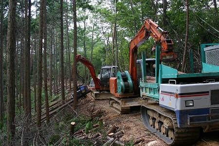 間伐作業2 Tweet 2009年09月13日 これが肝心で、コース取りによって作業効率が大きく変わります。 その後、チェンソーで木を倒して、ワイヤー等で道まで引っ張り出して 3mや4m、6mの丸太に造材するという流れです。 長さの規格というものは、様々ですが皆さんの家の中を想像してください。 例えば6畳間であれば、長い辺には4m材が必要で、短い辺は3m材で 十分ということになります。2階までの通し柱には6m材が使われます。 記事詳細へ