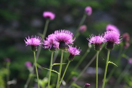 アザミ Tweet 2010年06月08日 初夏の野を紫に彩る花です。 背が高く、草むらからスッと頭を出した花にはチョウやハチが群がります。 草刈りの際にも残したくなるのですが、ついつい刈ってしまいがち。 葉には棘があるため、そのままの姿で観賞するのが良い。 花言葉は『権威、触れないで、独立』など。 記事詳細へ