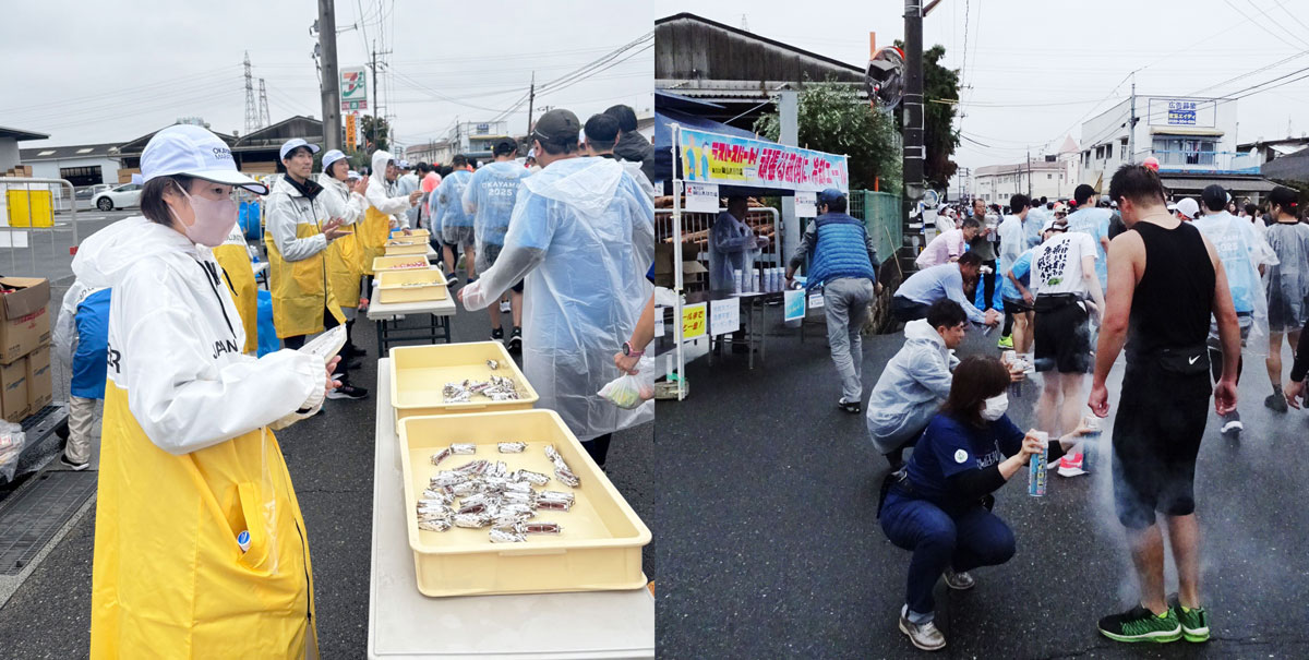 今年も服部興業は、35km付近の第11給水所にて従業員・OG計5名が給食ボランティアを行い、ランナーにモンキーバナナカステラや高瀬舟羊羹をお渡ししました。