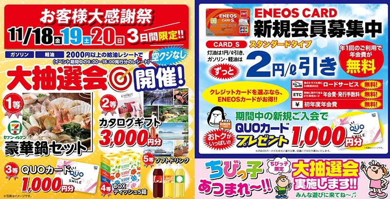 11月18日(金)19日(土)20日(日)の3日間、セルフ古都宿SSとセブンイレブン岡山古都宿店にてお客様大感謝祭を開催します! 2,000円以上の給油でご参加いただける空くじなしの大抽選会や、ちびっ子限定大抽選会などお得満載で皆様をお待ちしております。 ぜひこの週末は、セルフ古都宿SSとセブンイレブン岡山古都宿店にご来店ください。 イベントタイム:9:00~18:00