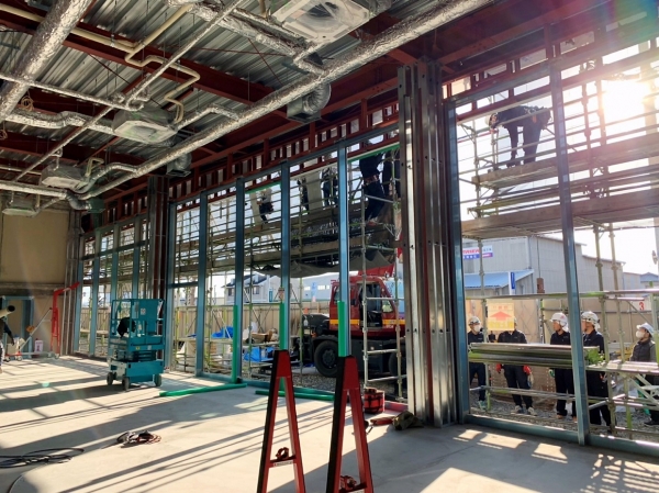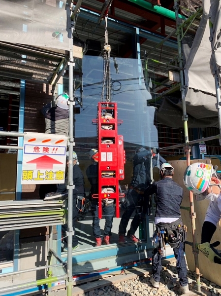 フロントサッシに15mmガラスで1650×4400(270kg)8枚他38枚施工した建物です。