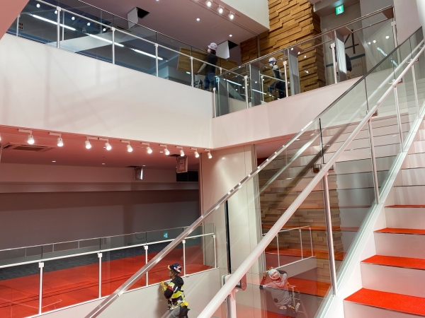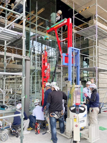 2階吹抜けでスタビライザー工法のフェイスガラスには19ミリで1550×6050(450kg)を32枚、リブには30mm合わせガラス29枚使用した建物です。