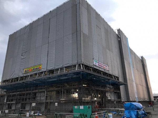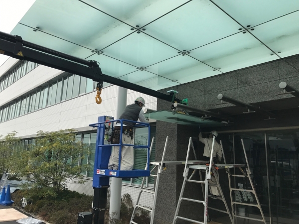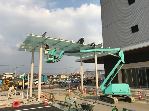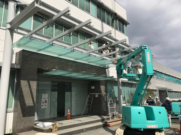 事務所入り口にはDPG庇と、 既設棟の既存庇も一回り大きいDPG庇に新設。