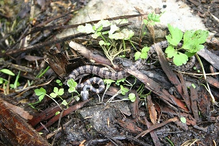 毒のないヘビで、日本固有種です。この個体は、太さが約1cm、体長は20cmほどと小ぶりでした。50cm前後まで大きくなる種のようです。夜行性であまり昼間に姿を見せることはありませんが、日光浴をしに出てきたのでしょう。爬虫類は自分で体温調節ができないため、まだ朝晩涼しいこの時期は日当たりの良い場所で日光浴をします。