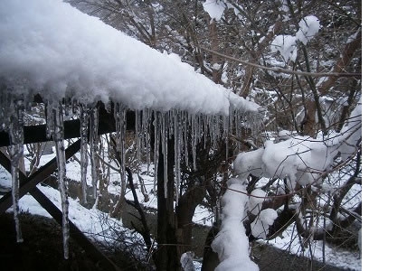 つらら Tweet 2008年02月14日 2月14日、落合の朝の気温は?4℃、今年一番の冷え込みとなりました。前日に降り積もった雪はカチコチ、路面はツルツル、まだまだ春は先でしょうか。 炭窯に火を入れていたため、屋根の雪が解けてつららが見られました。つららはただ寒いだけではできず、流れる水が氷点下の空気にさらされ固まります。雪→水→氷の状態変化です。偶然の景色でしたが新鮮に映りました。 記事詳細へ