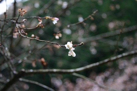 シキザクラ(四季桜) Tweet 2009年12月15日 紅葉が終わり木々の落葉もだいぶ進んでいる今日この頃ですが、 山荘のダム沿いにシキザクラの花が1本咲いています。 春の開花時は他のサクラに紛れるため目立ちませんが、 秋の開花は目に留まります。淡い白色で春よりも小ぶりな花ですが、 寒空のもと、ひっそりと咲く姿はたくましいです。 隣には春に備えた冬芽も見られ、冬の期間もただ休眠しているだけではないという 生きる姿を感じました。 記事詳細へ