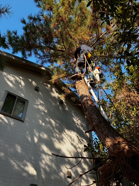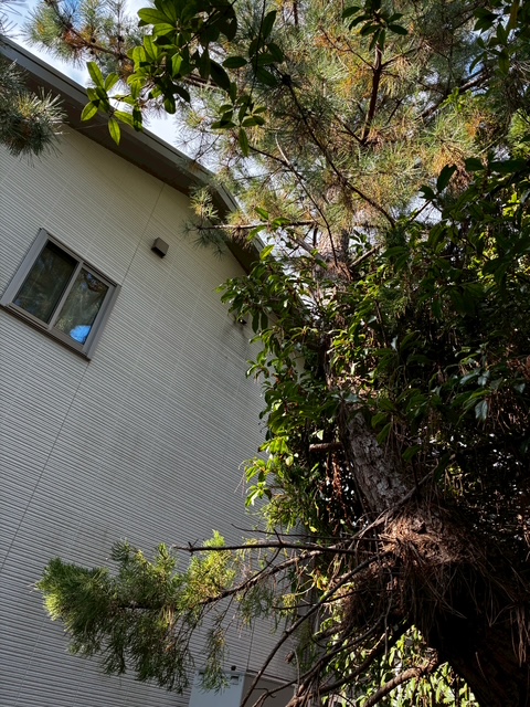 大きく伸びたクロマツが隣家の壁・屋根に迫っている状態でした。
