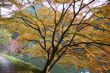 各地で紅葉が見頃となっています。落合の山は年中緑色の植林が多いのですが、所々に自生するモミジやケヤキ、リョウブやハゼノキなどが色付きます。不思議なもので、同じモミジでもまだ青々としている個体もあればオレンジに染まっているものもあり色々です。日当たりや湿度によって違うのでしょうか?